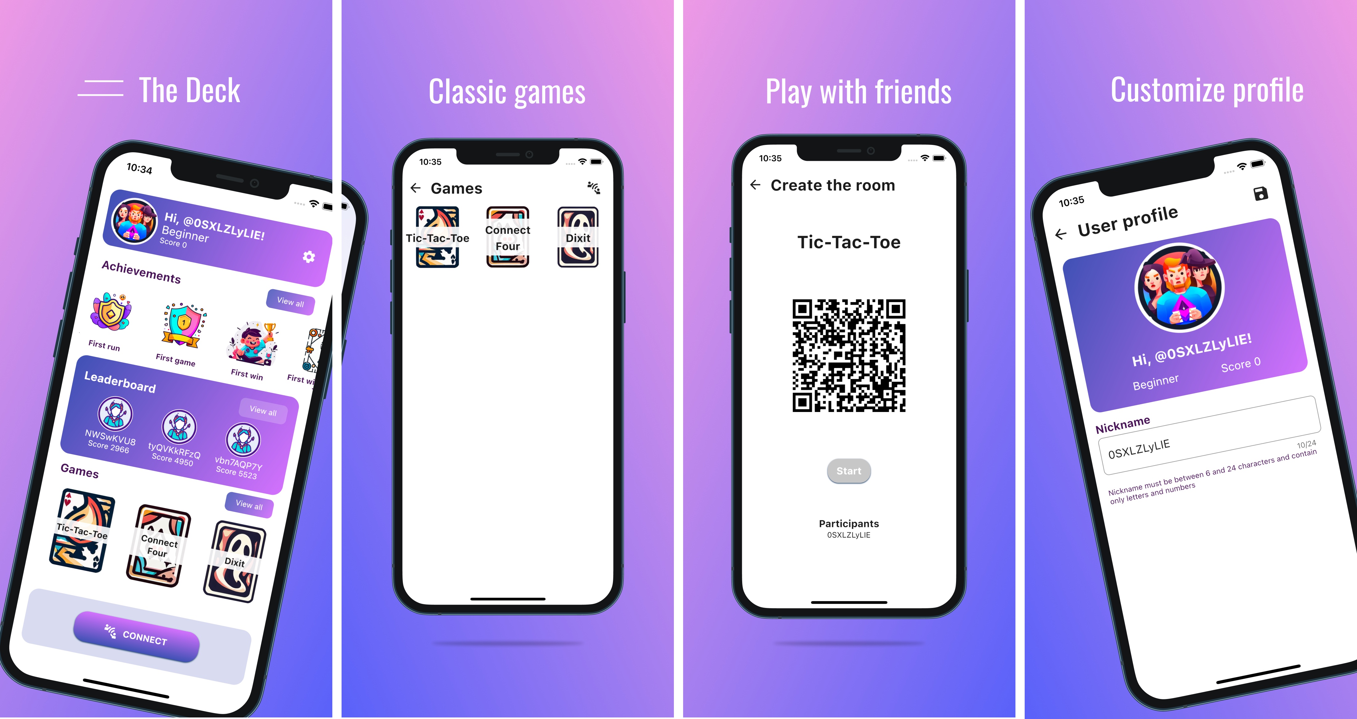 The primary goal of “The Deck” is to provide a user-friendly and cooperative digital game environment for playing classic games that were usually played with cards on paper. One of the standout features of “The Deck” is its unique ability to assign one device as the “table” (a.k.a. deck). By placing this device in the middle of the group, all players can witness the real-time state of the cards. This adds a new level of immersion making it a truly captivating experience.
